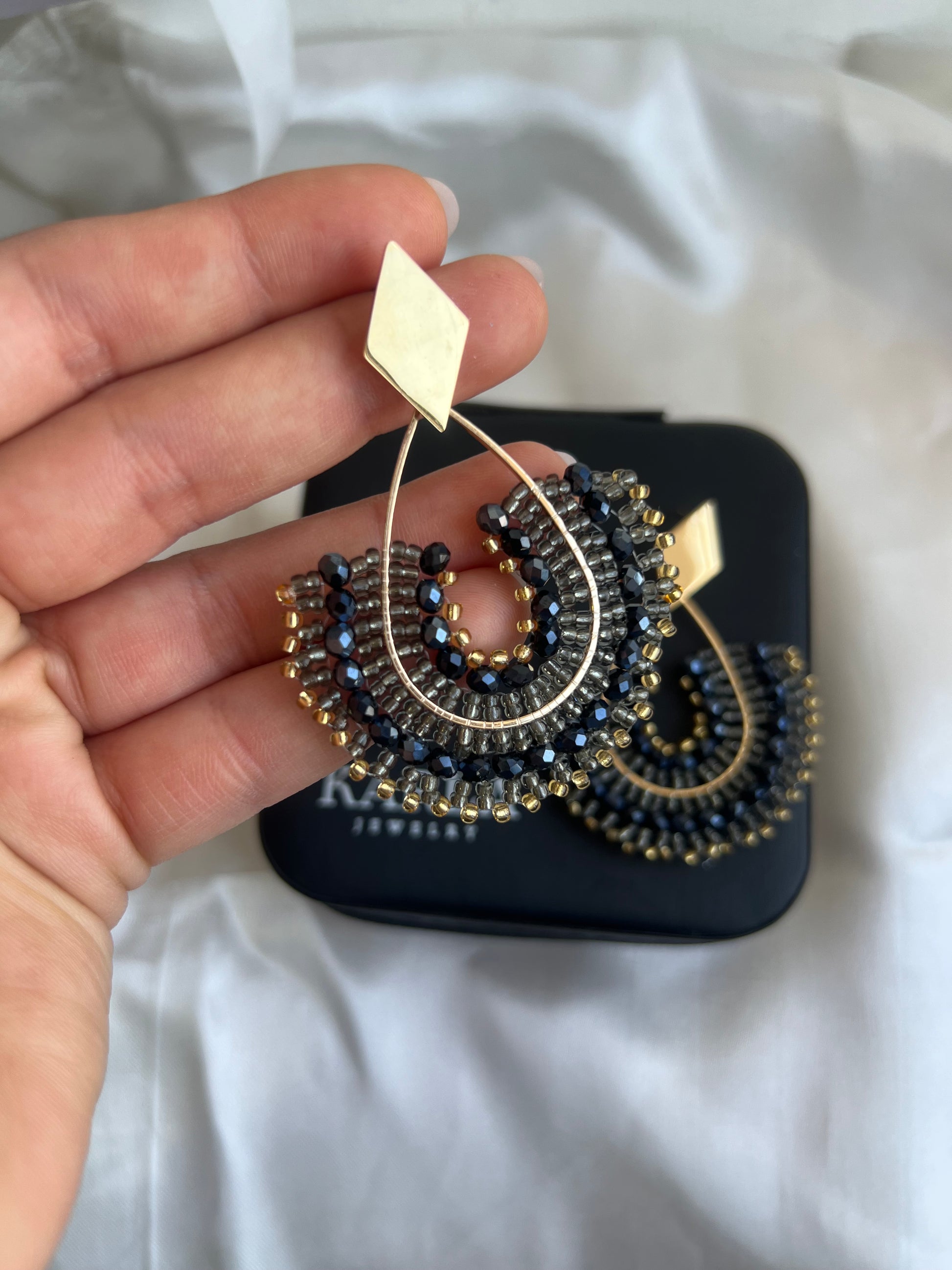 Aros hechos a mano con mostacillas y cristales, con base de acero quirúrgico, muy ligeros.