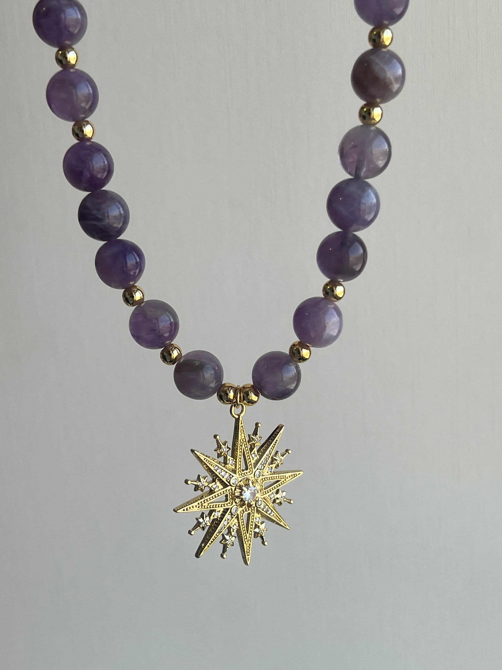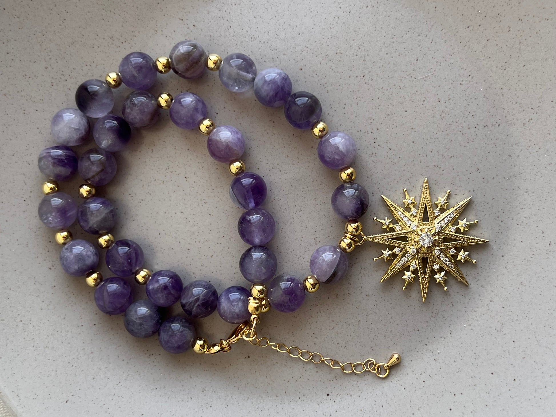 Hecho a mano con Piedras naturales Amatistas de 10mm, broches, dije y terminaciones con baño de oro 18k, libre de níquel e hipoalergénico. Cadena de 48 cm de largo